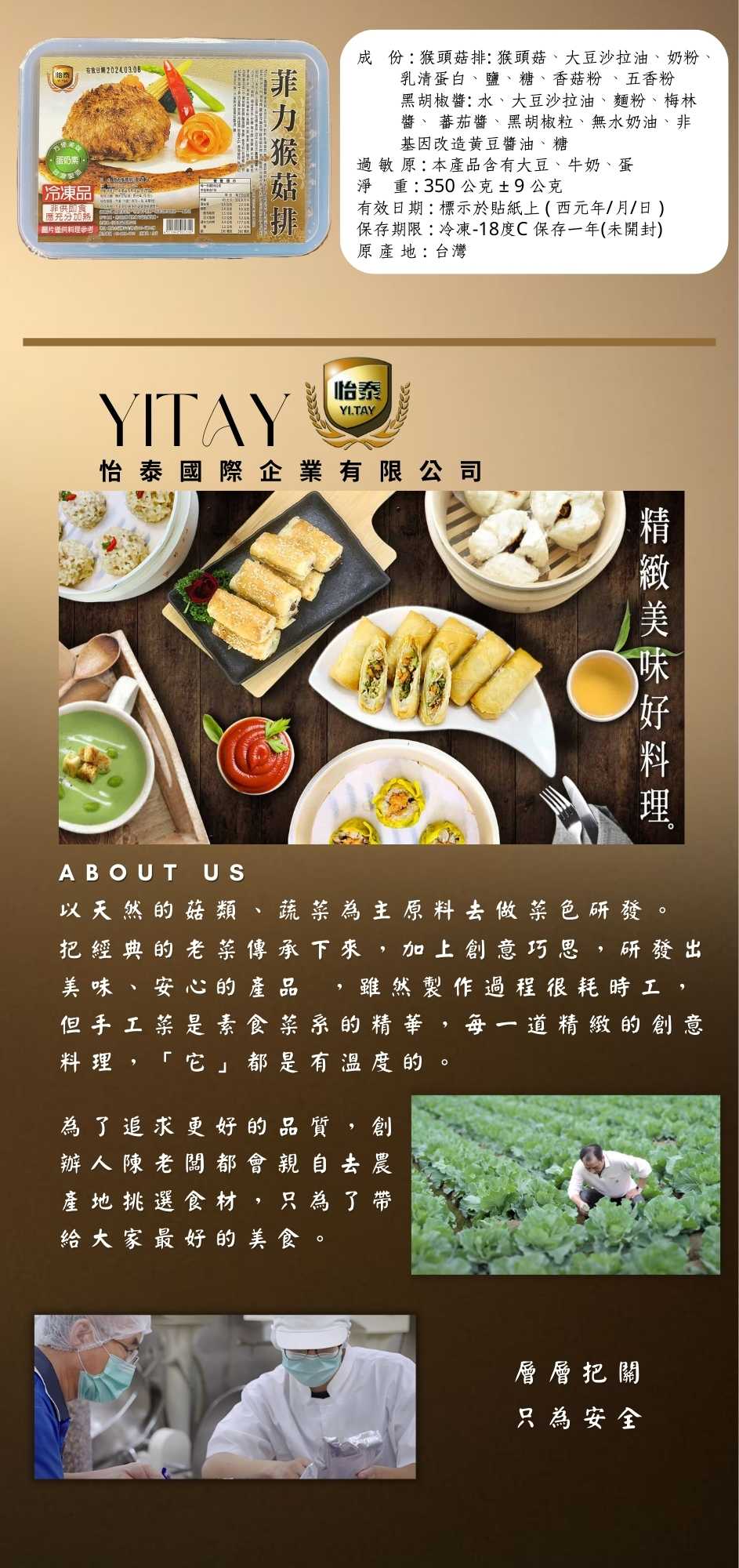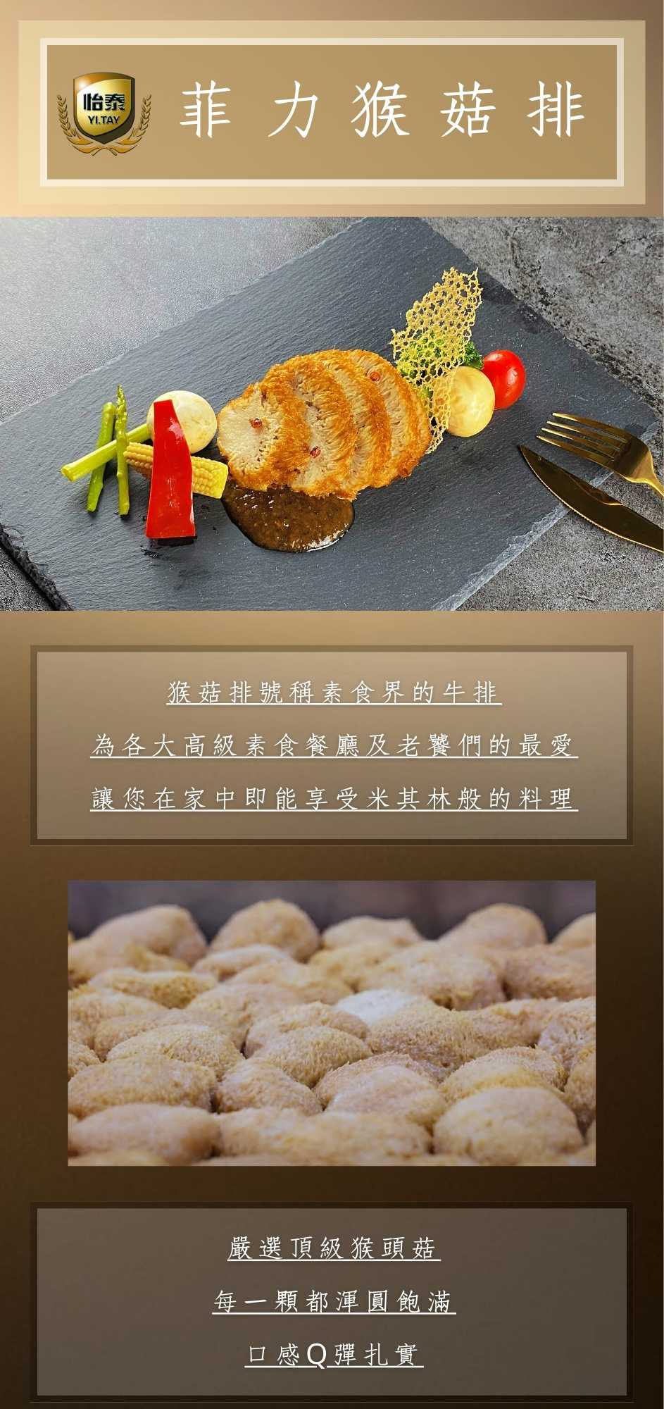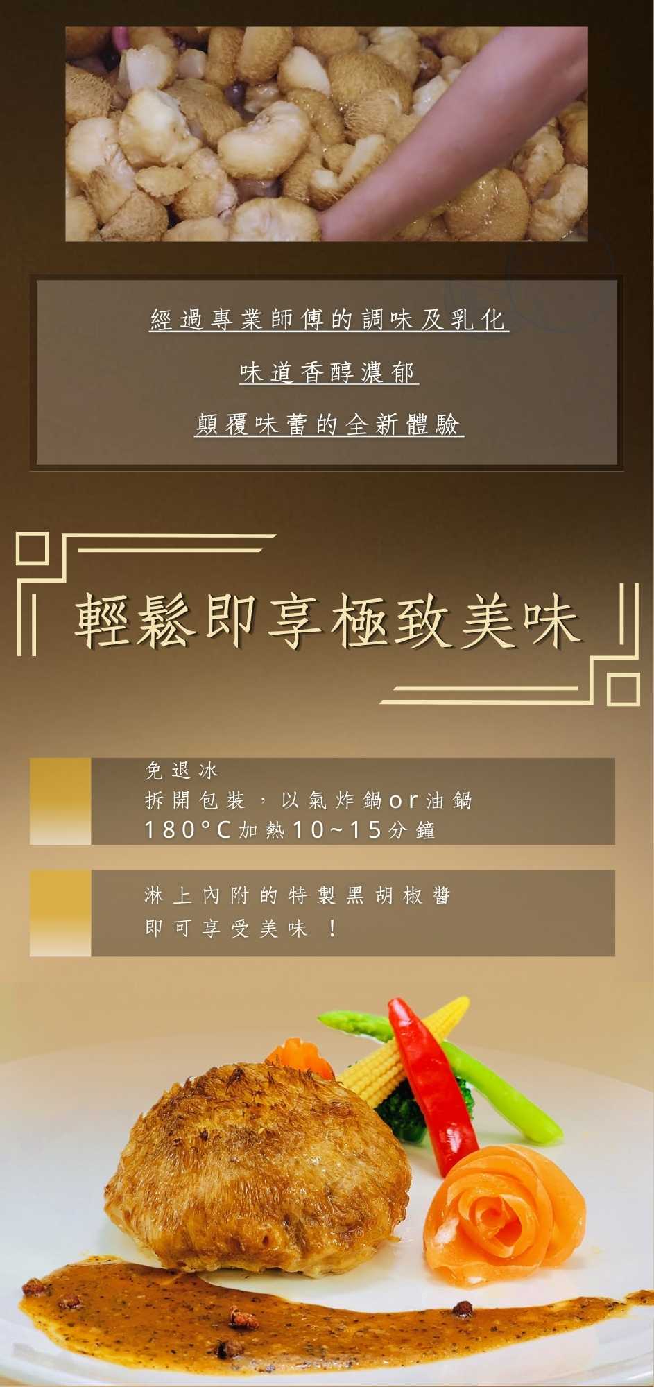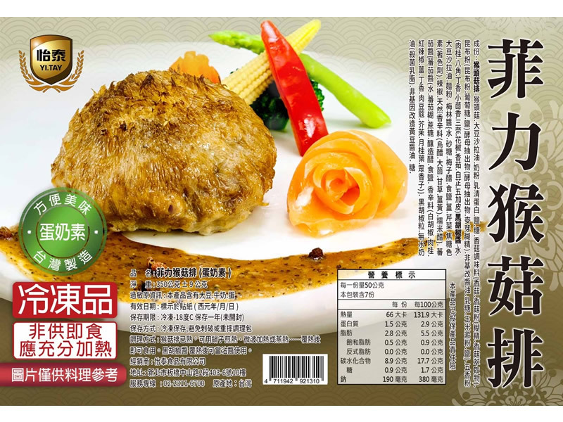 | 調理方式 : | 猴菇排已熟,可用鍋子煎熱、微波加熱或蒸熱,覆熱後即可食用。 黑胡椒醬覆熱後可當沾醬使用。 |