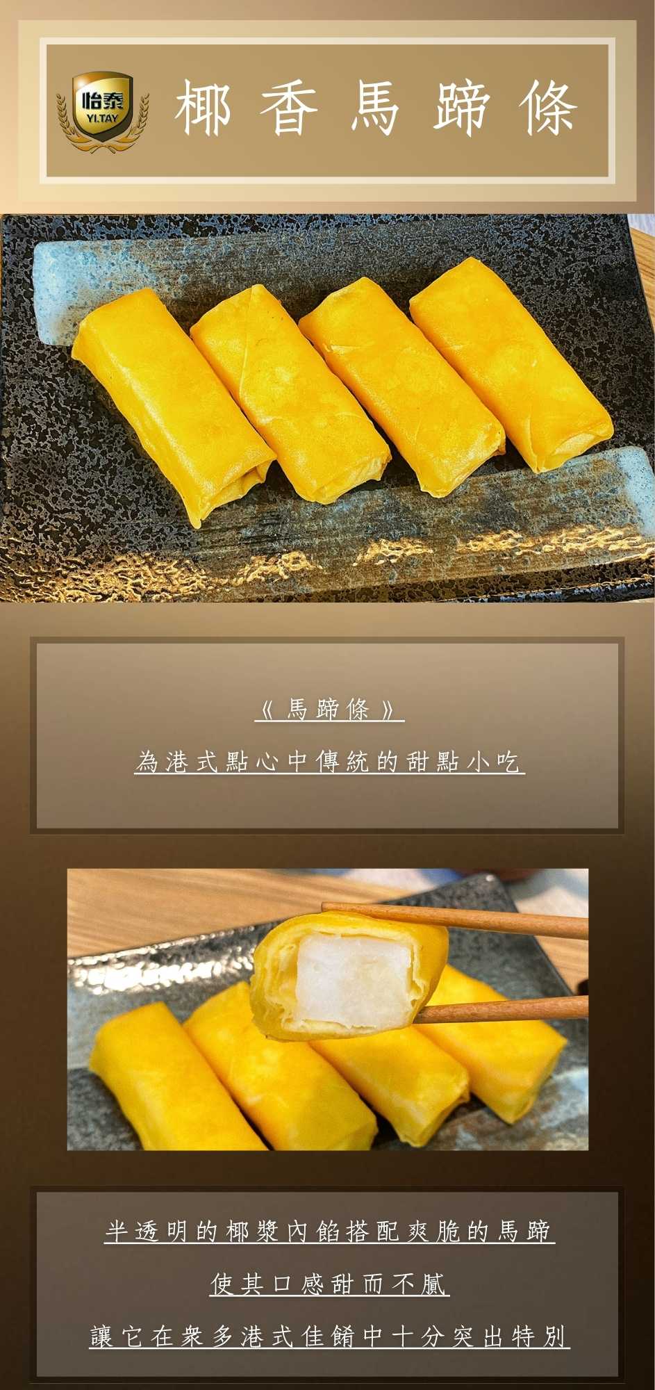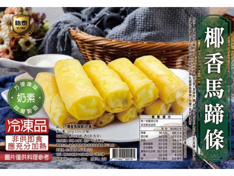 | 成 份 : | 水、春捲皮(麵粉.水.鹽.食用色素黃色4號)、馬蹄肉、 糖、純椰漿、 馬蹄粉、麵粉、煉奶{蔗糖.乳粉.純水.麥芽糖.椰子油.乳化劑(脂肪酸甘油脂.乳酸硬脂酸鈉).乳糖}、馬鈴薯澱粉 |