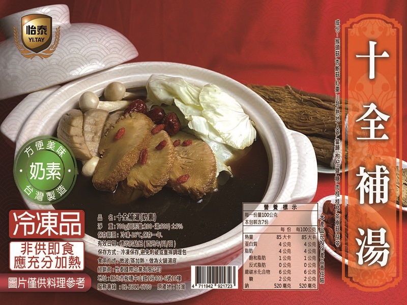 | 成 份 : | 水、猴頭菇、杏鮑菇、紅棗、川芎、熟地、人蔘、當歸、枸杞、鹽、糖、肉桂、桂枝、茶樹菇、茯苓 |
