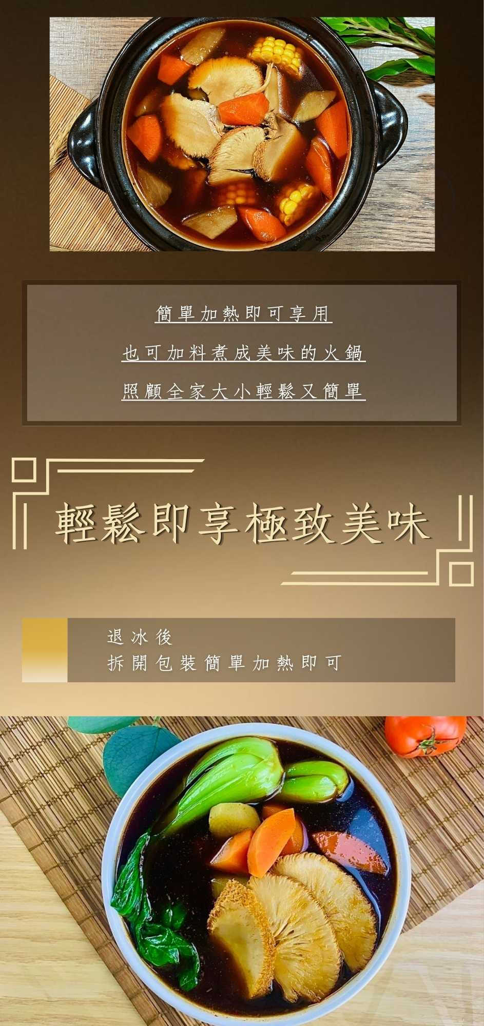 水、猴菇片、白蘿蔔、紅蘿蔔、玉米、蠔油、八角、花椒、草果、小茴香、辣豆瓣、辣油、沙茶、鹽、糖